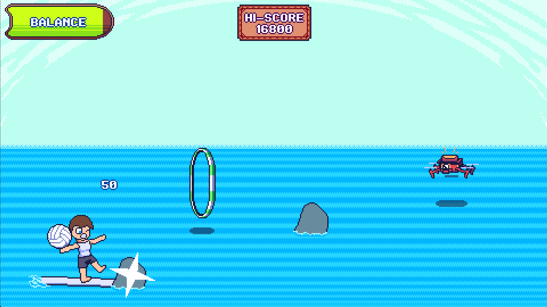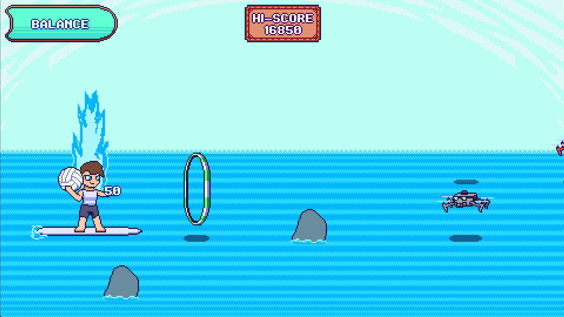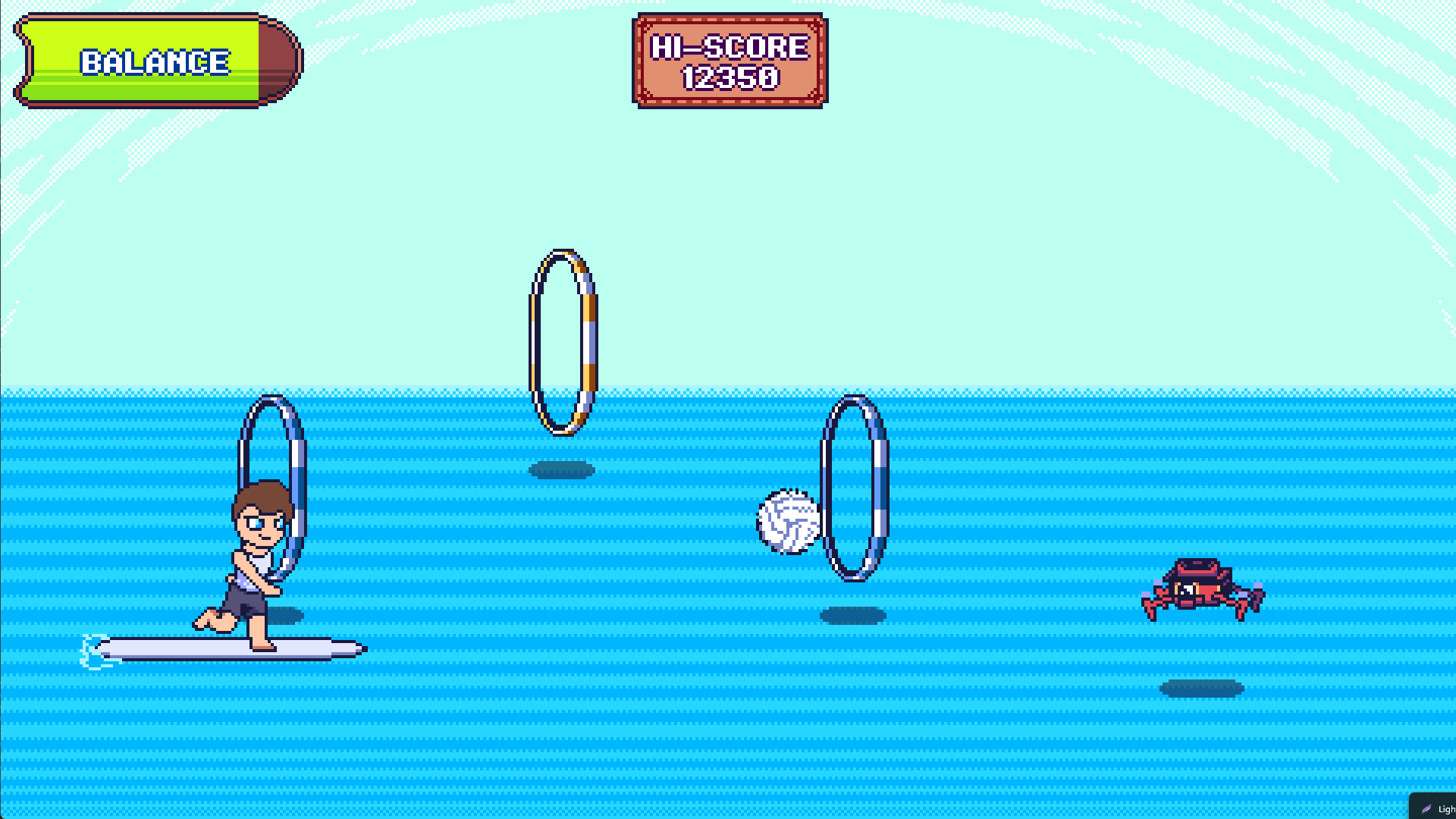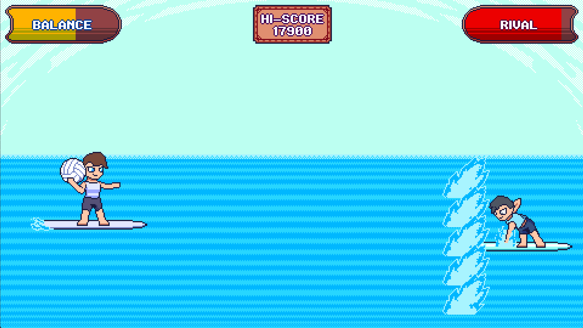During development, Surfball's progression system was meant to be tied to the rival battles since it was an in-universe competition and you are competing against them. The idea was that as you defeat rivals, your tournament rank would increase, which would boost the game's difficulty, and you would then be able to earn more points. The "true" goal of Surfball would have been to win the tournament and score the most points. However, due to time constraints for the jam, we were only able to add 1 rival to the game and there is no proper ending or objective. So in its current state, Surfball is an endless arcade game.
